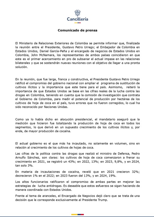 Durante el encuentro, en el que participaron el Presidente, Gustavo Petro Urrego; El embajador de Colombia en Estados Unidos, Daniel García-Peña, y el encargado de negocios de Estados Unidos en Colombia, John McNamara, el presidente colombiano ratificó el compromiso con la sustitución de cultivos e instó a Estados Unidos a basarse en cifras reales en la lucha contra las drogas, señalando errores reconocidos por la ONU en mediciones anteriores.